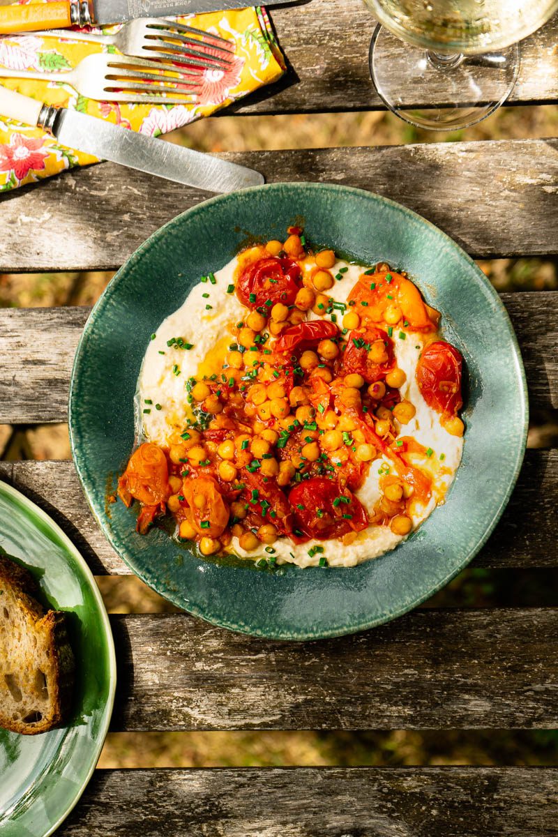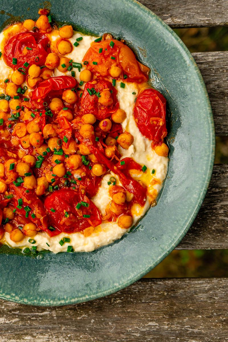 - Plate the butter bean dip by smattering it on a large serving plate. Then tip over the cooked tomatoes and sprinkle with the chopped chives. Enjoy immediately by dunking chunky slices of sourdough into this glorious mess.