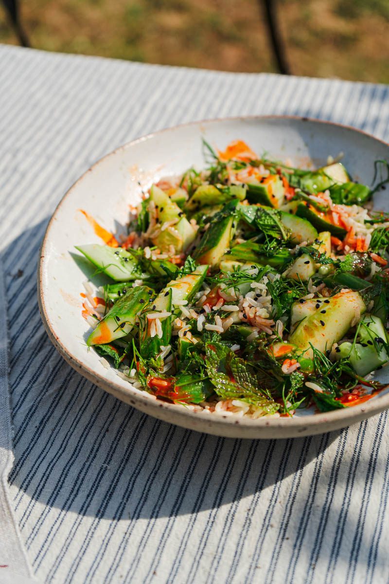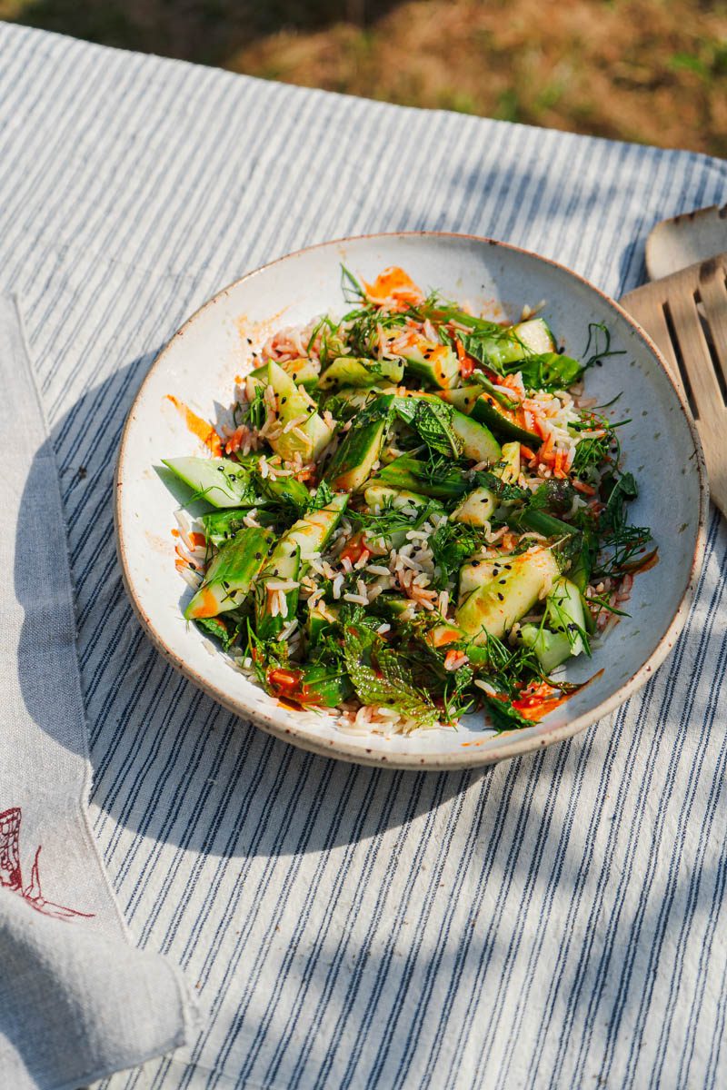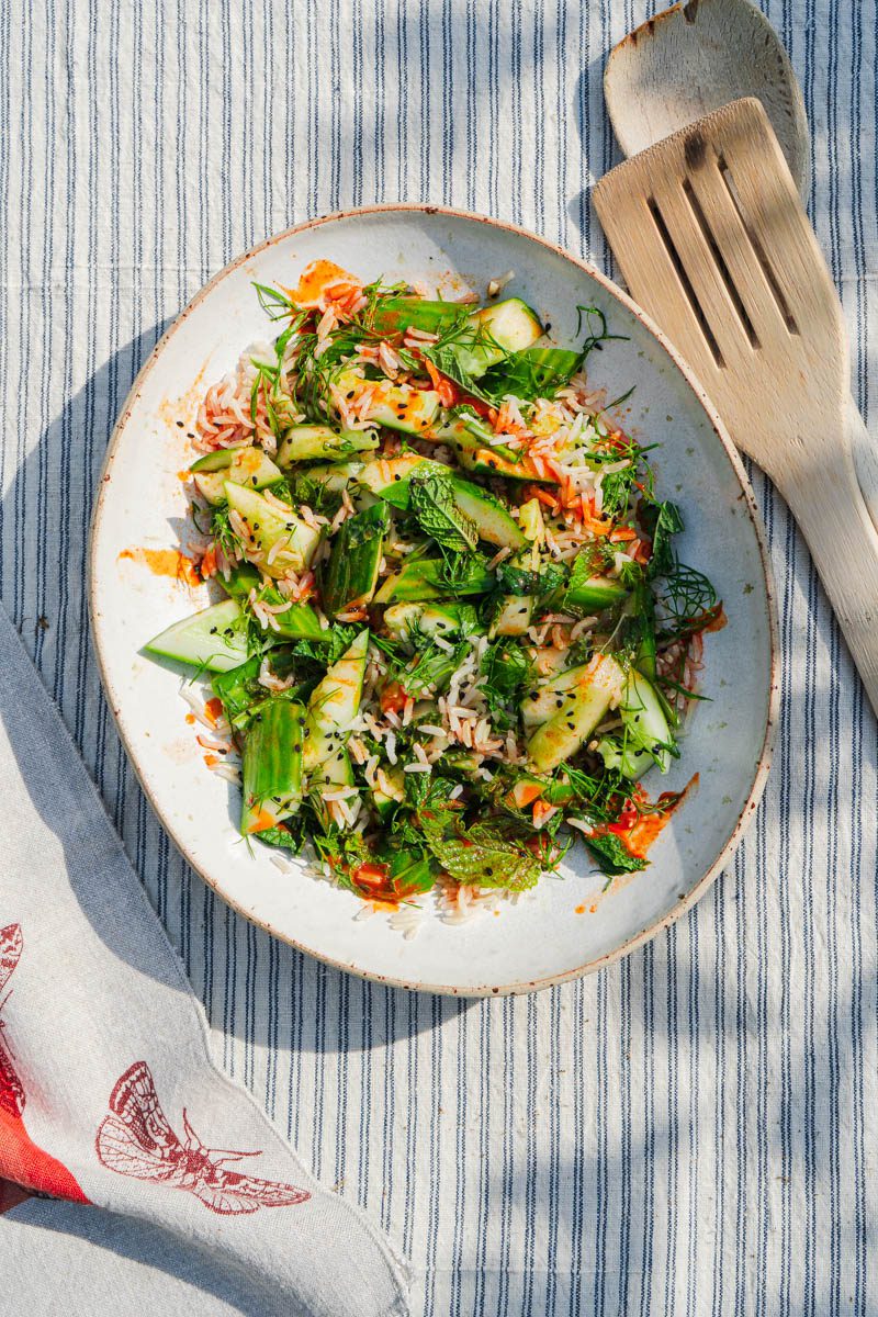 - Tip the chopped cucumber into a large mixing bowl, along with the 150g of cooked brown rice, 20g of chopped dill, 10g of chopped mint, 2 tablespoons of nigella seeds and a teaspoon of salt. Toss well to combine.