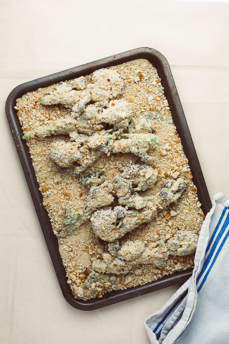 - Take a broccoli floret and dunk into the cornflour slurry. Coat the piece entirely before removing and placing into the breadcrumbs. Completely cover the floret in the breadcrumbs. Remove and place the breaded floret onto a clean baking tray. Repeat this process until all of your broccoli pieces are coated.
