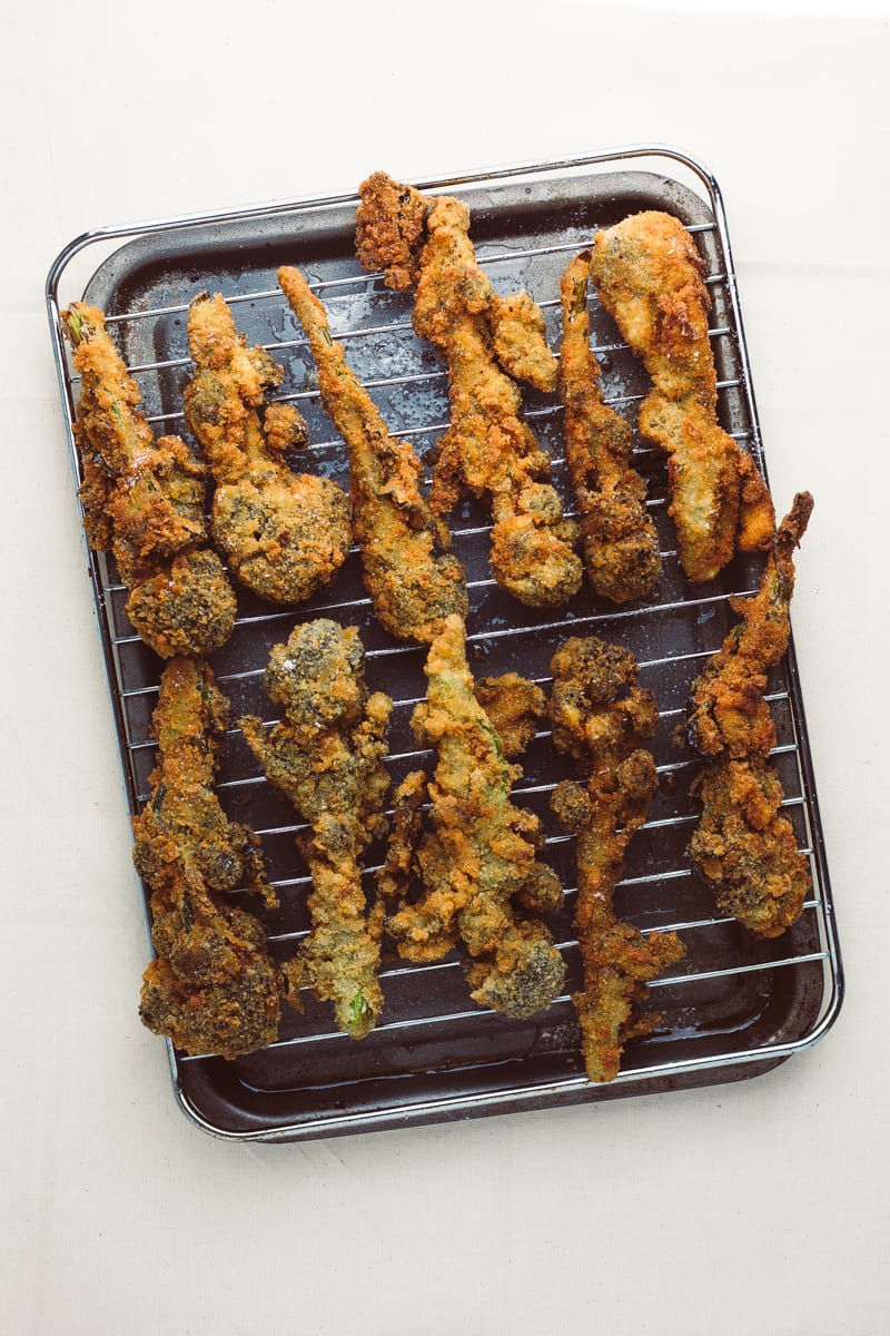 - Place about 3-4 florets (don't try and crowd your pan) into the hot oil and fry for 5 minutes until golden and crispy on the underside. (Whilst cooking occasionally baste the florets with hot oil. This will help them get super crunchy.) Turn and repeat on the opposite side until evenly golden brown. Remove the finished florets and place onto a wire rack. Season immediately with a generous helping of salt. Repeat the frying process until all of your florets are cooked.