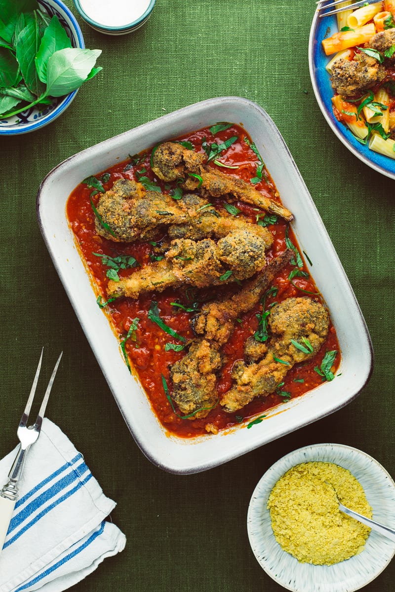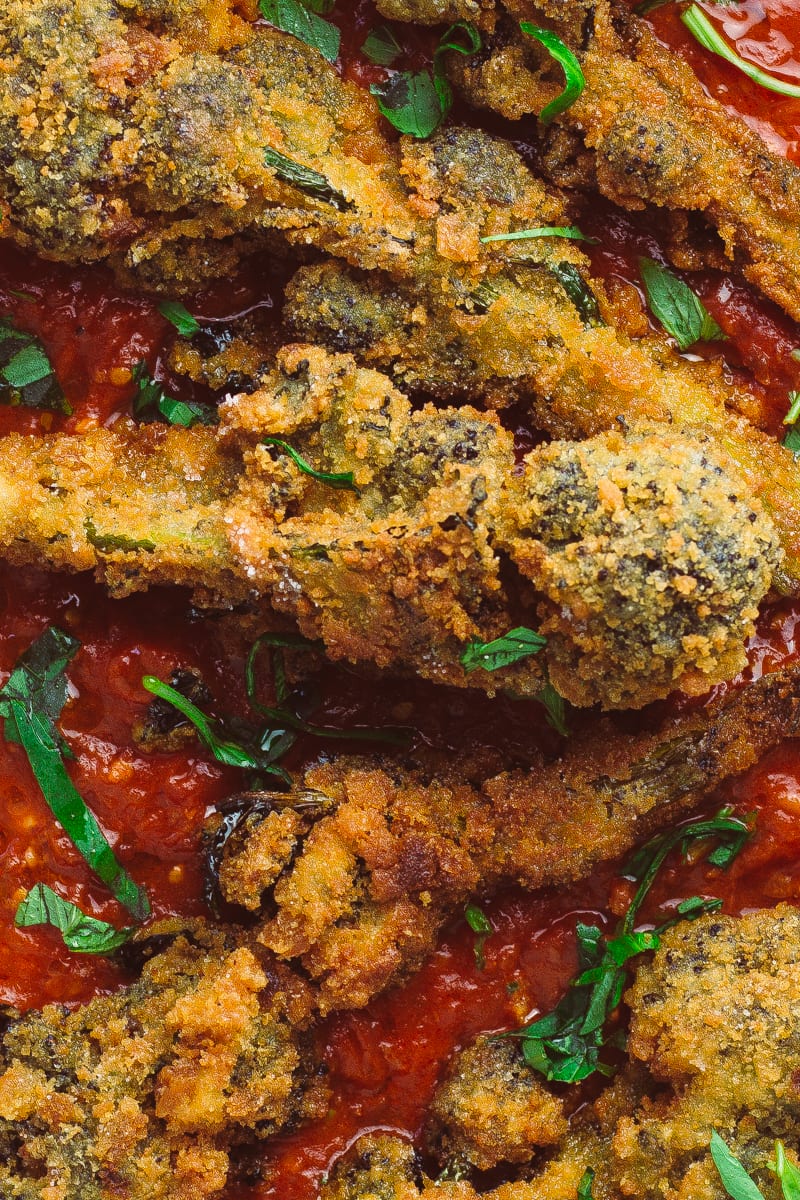 This recipe for crispy broccoli with a rich marinara sauce is an amazing way to celebrate the seasonal superstar. This dish is designed to be enjoyed on its own, but I love throwing in a pasta base to enjoy with the tomato and broccoli. Slurping smooth spaghetti whilst crunching down on the battered broccoli is other worldly - I advise you give it a go.