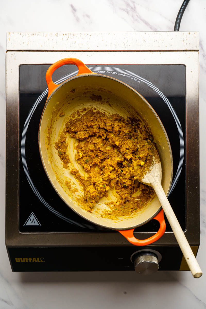 Heat a large casserole dish over a medium heat and pour in the onion paste. Fry for 5 minutes until the onion is starting to take a little colour.