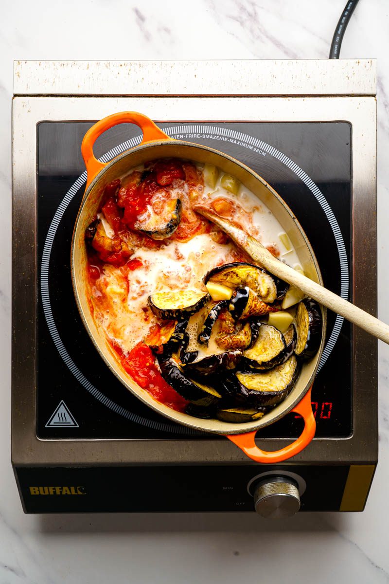 Once roasted tip the cooked aubergine into the casserole dish. Then add the 400g of cubed potatoes, 1 can of coconut milk and 1 can of chopped tomatoes. Mix the pan contents to combine all the ingredients.