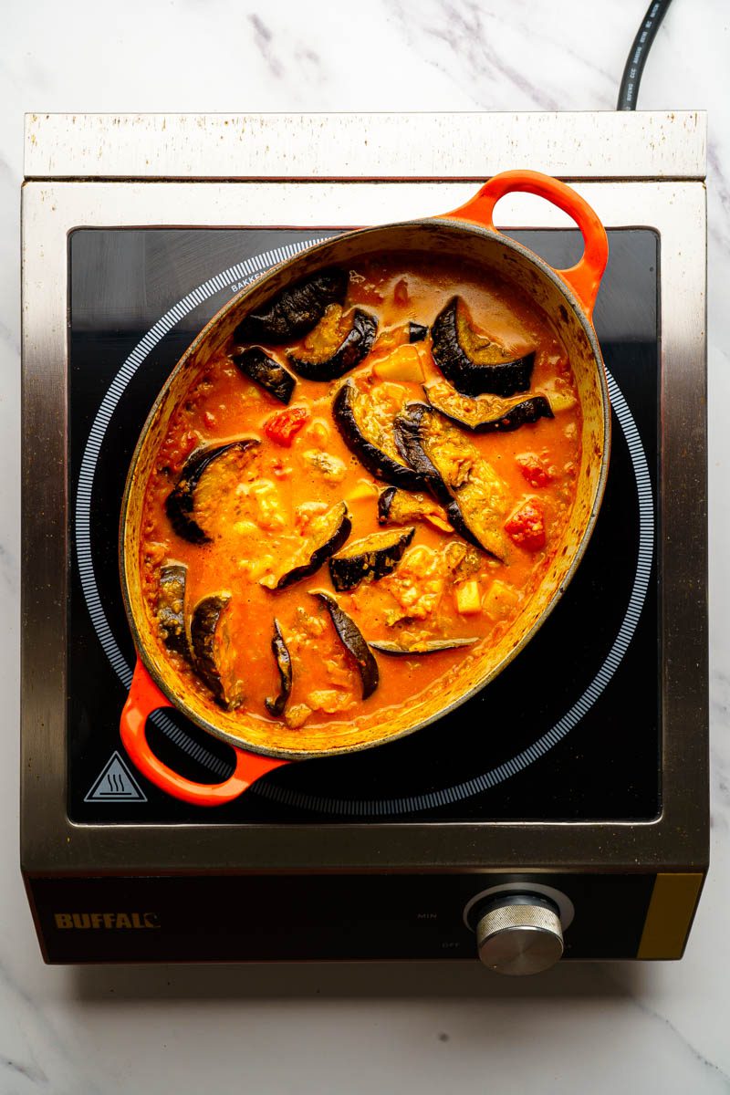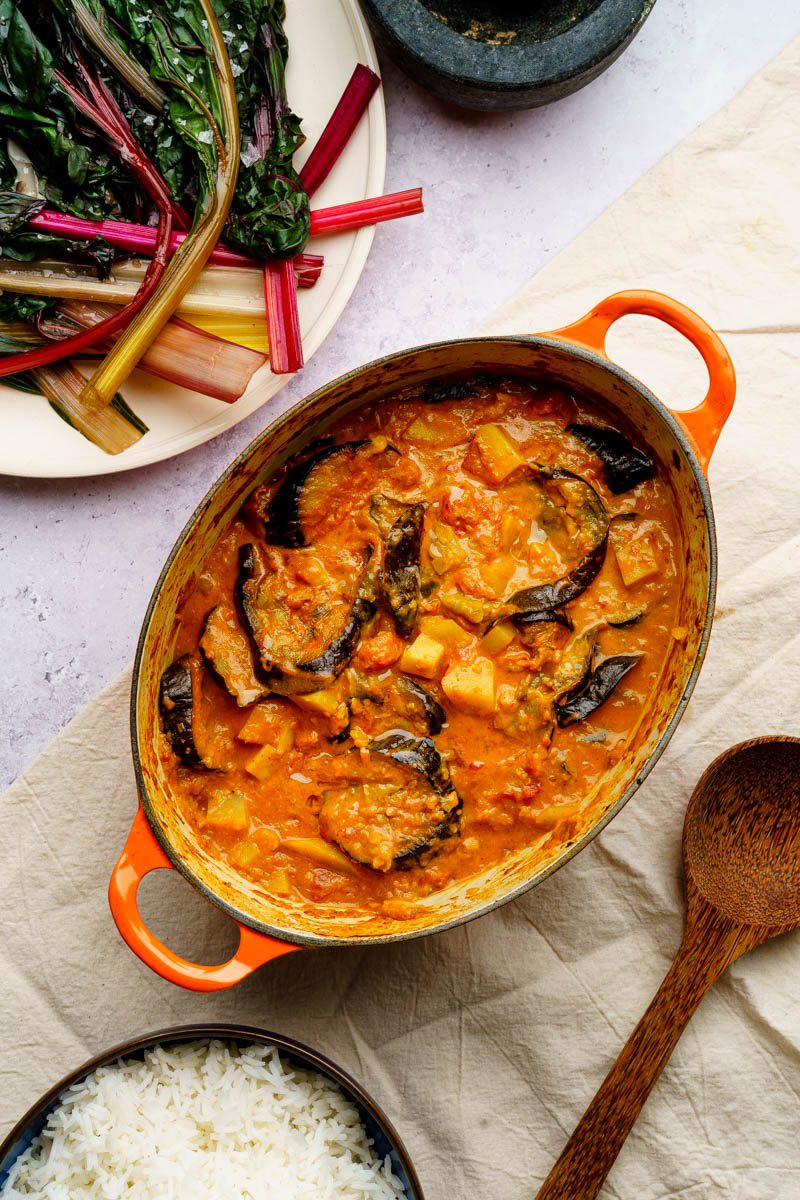 A wonderfully decadent aubergine and potato curry. Smooth roast aubergine baked in a rich coconut sauce. Delicious.