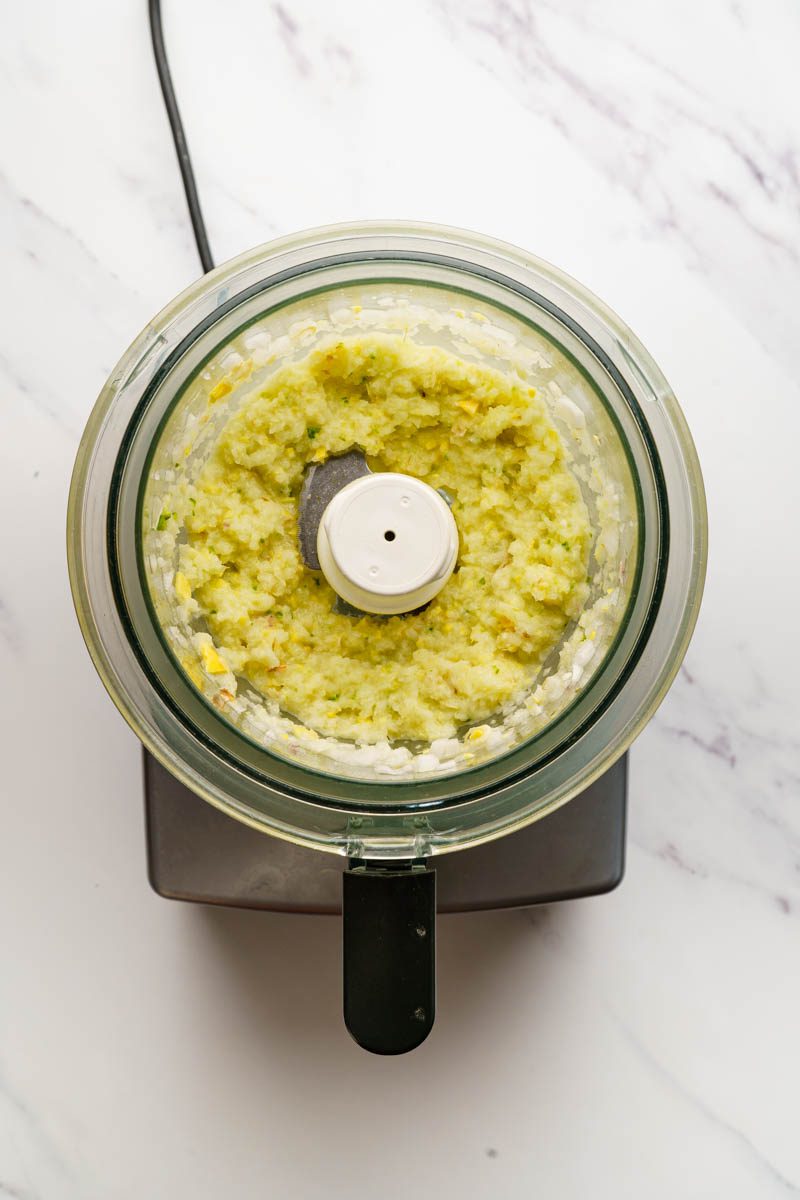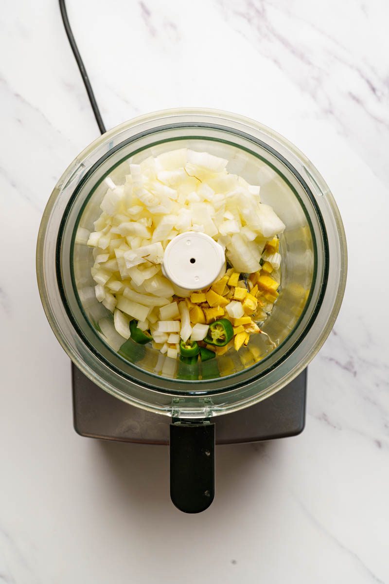 Place the 2 diced onion, 8 cloves diced garlic, 1 chopped green chilli and 1 tablespoon of vegetable oil into a food processor or blender. Blitz into a chunky paste.