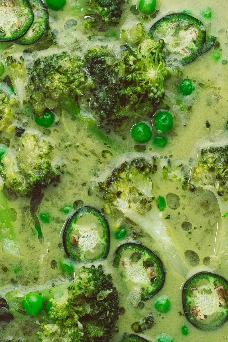 Spicy, fresh and utterly delicious - this broccoli and pea soup is a winner. This hot and fragrant soup is the perfect way to enjoy your brassicas. The fresh and sweet peas help mellow out the sometimes strong flavour of broccoli. Think of this soup as a blend of between a broth and a thai green curry. It’s filling and flavourful enough to have just on it’s own, but toss in some fried tofu and rice and it could easily pass for a sumptuous curry. It’s versatility is delightful!